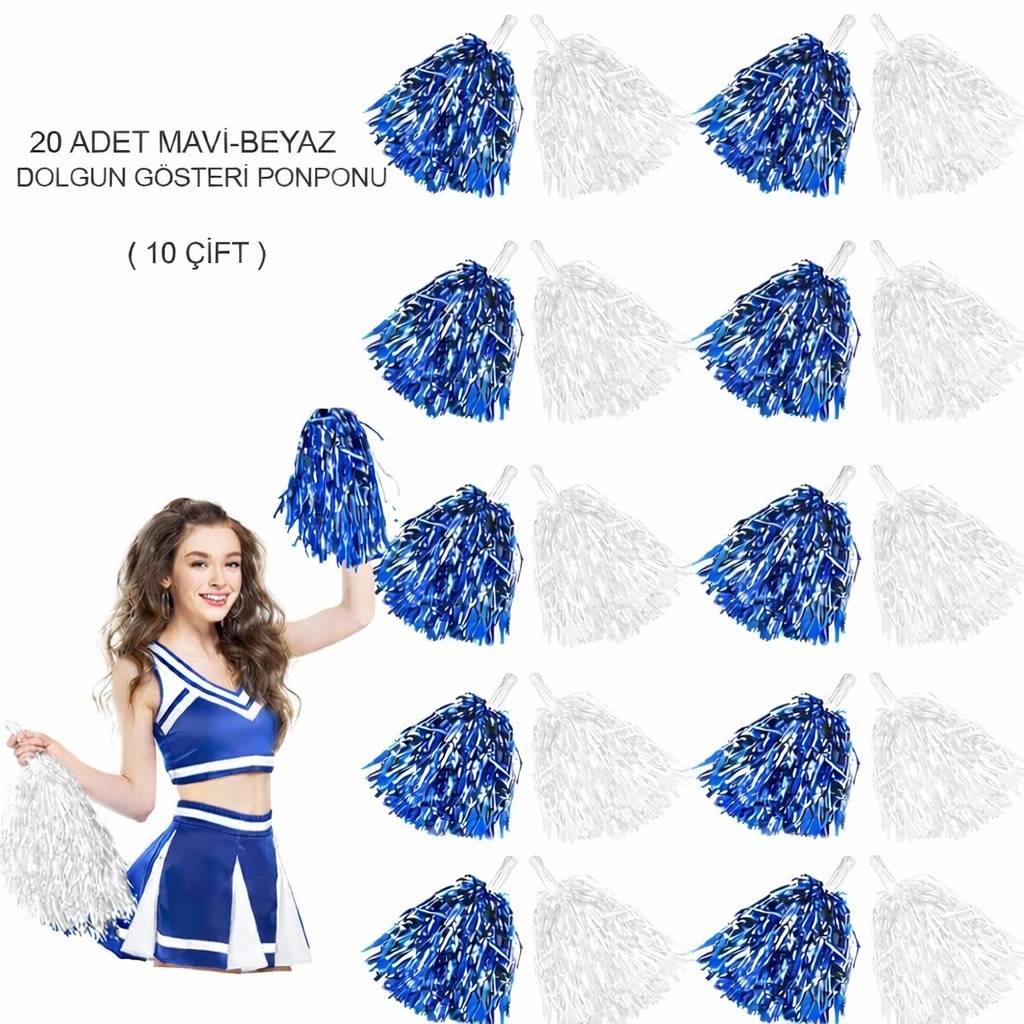 MAVİ - BEYAZ METALİK DOLGUN GÖSTERİ PONPONU 20 ADET (10 ÇİFT)Ürün ÖzellikleriMavi–beyaz metalik dolgun gösteri ponponu seti, ferah renk uyumu ve yüksek parlaklığa sahip metalik dokusuyla sahne ve grup performanslarında güçlü bir görsel etki yaratmak için tasarlanmıştır. Hareket ettikçe ışığı yansıtan parlak yapısı, dans adımlarını ve tezahüratları daha enerjik ve dikkat çekici hale getirir. Dolgun formu sahnede hacimli ve profesyonel bir görünüm sunarken, hafif malzemesi uzun süreli kullanımlarda elde yorgunluk oluşturmaz. Ergonomik tutma yapısı sayesinde rahat kavranır ve performans sırasında kontrolü artırır. Okul etkinlikleri, amigo takımları, dans ve sahne gösterileri ile kostüm ve organizasyon aksesuarı olarak geniş bir kullanım alanına sahiptir. Toplu kullanımlar için ideal olan 20 adetlik set, grup gösterilerinde renk uyumu ve görsel bütünlük sağlar; fotoğraf ve video çekimlerinde net ve etkileyici kareler elde edilmesine katkı sunar. Dayanıklı ve tekrar kullanılabilir yapısıyla sık etkinlikler için pratik bir çözümdür.Paket İçeriği20 adet Mavi Beyaz Metalik Dolgun Gösteri Ponponu Seti (10 Çift)